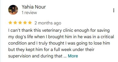 اكتشف آراء عملائنا وتجاربهم معنا حيث يشارك أصحاب الحيوانات الأليفة ثقتهم في فريقنا البيطري المتخصص، وجودة الرعاية والاهتمام الذي نقدمه على مدار الساعة