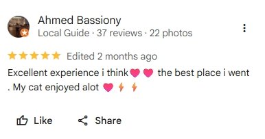 اكتشف آراء عملائنا وتجاربهم معنا حيث يشارك أصحاب الحيوانات الأليفة ثقتهم في فريقنا البيطري المتخصص، وجودة الرعاية والاهتمام الذي نقدمه على مدار الساعة